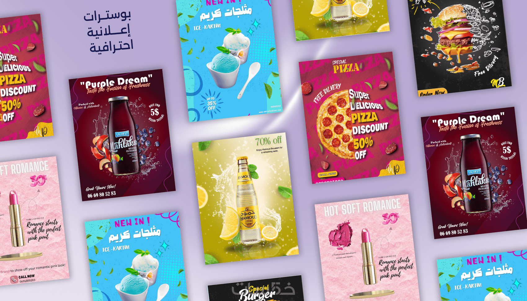 أقدم لك تصميم بوستر إعلاني احترافي بجودة عالية يناسب جميع أنواع المنتجات، سواء كانت أطعمة، مشروبات، مستحضرات تجميل، إلكترونيات، أو غيرها. أهتم بأدق التفاصيل لضمان تصميم جذاب يعكس هوية منتجك ويجذب العملاء باللغة التي تريد.